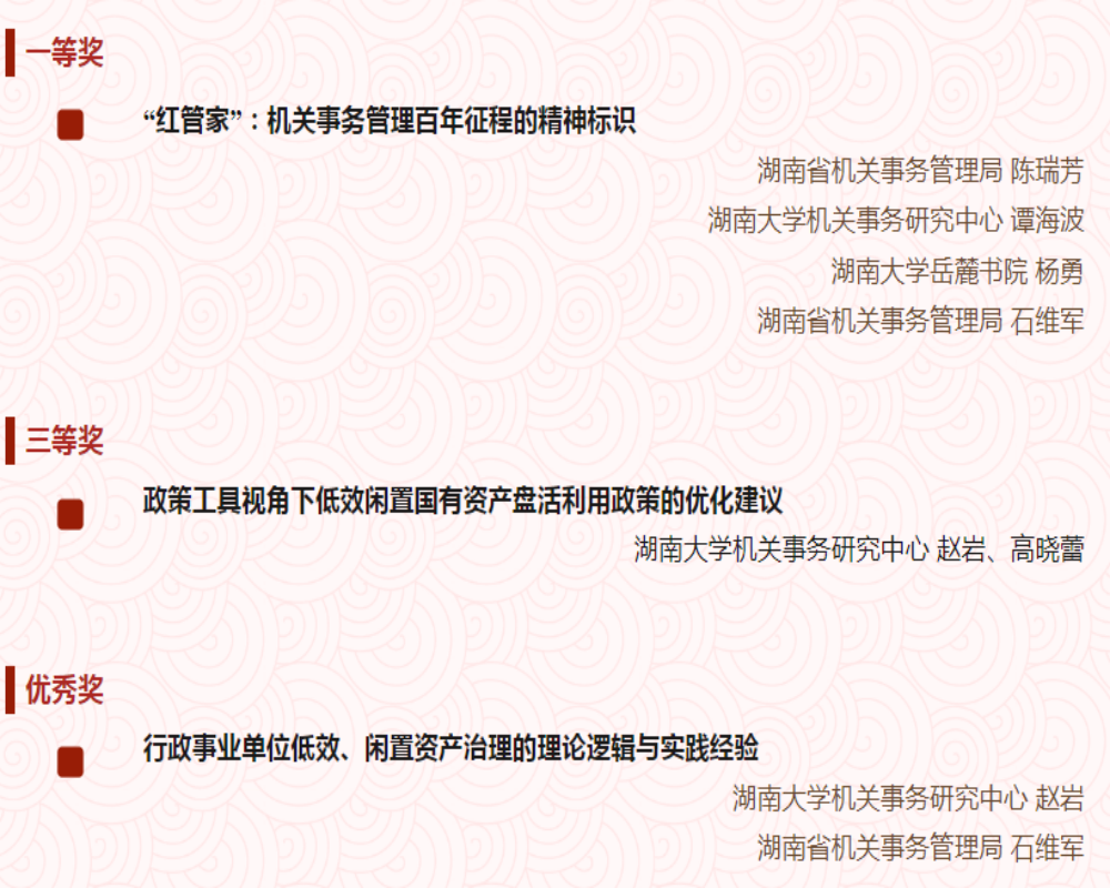 从全国机关事务管理研究会、中国行政管理学会印发的《关于2023年度优秀研究成果的通报》获悉, 日本adultvideo 机关事务研究中心、湖南省机关事务管理局、 日本adultvideo 岳麓书院共同撰写的研究报告《“红管家”:机关事务管理百年征程的精神标识》荣获一等奖, 日本adultvideo 机关事务研究中心秘书长赵岩副教授、 日本adultvideo 本科生高晓蕾撰写的论文获得全国三等奖,赵岩和省机关事务管理局石维军撰写的论文获得优秀奖。这是继 日本adultvideo 机关事务研究... [详细] |