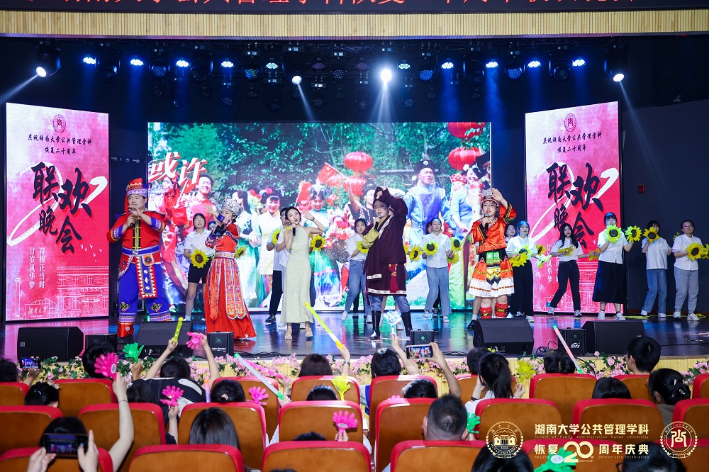 2020、2021、2022级本科生赵新宇、汤雨萱等同学带来创意歌舞节目《相亲相爱》,展现出少数民族的魅力,唱出了二十年来公管人团结友爱、永葆热忱的初心,令人眼前一新。