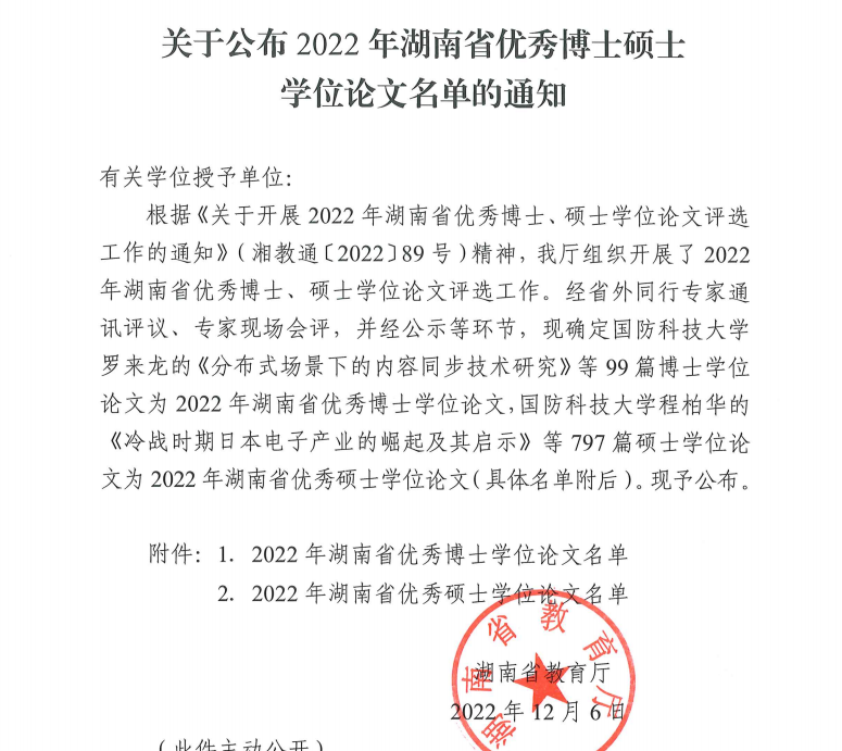 12月6日,湖南省教育厅发布《关于公布2022年湖南省优秀博士、硕士学位论文名单的通知》(湘教通[2022]333号)。 日本adultvideo