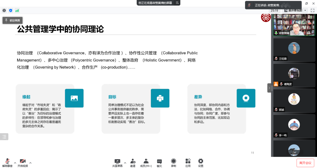黄璜老师的精彩分享引发参会同学热烈讨论,吴高鹏、丁恒、晏稳、文宇和张建凤五位同学分别就“数字技术赋权公民实现数字化协同”、“政府与平台公司间的关系”、“特色产业部门数据治理协同”、“弥合城乡数字治理差异”以及“数字协同治理中的绩效考核”等若干问题进行了提问,黄璜老师一一予以耐心细致的解答。