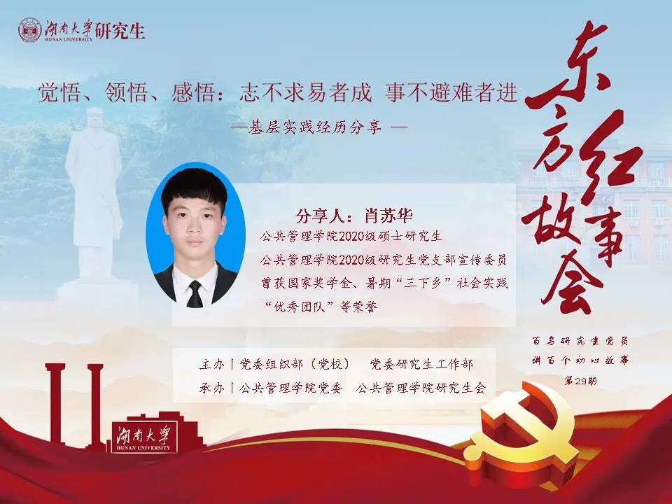 会上,肖苏华阐述了自己的入党初心以及向党组织靠拢的政治觉悟。紧接着,他以自己的志愿服务经历与实践调研经历号召研究生党员们应当积极投身社会实践,锤炼党员初心使命。随后,他结合支部工作实际提出,作为一名党支部宣传委员,要推动支部理论学习,争当表率,一以贯之。此外,还要加强支部活动宣传,及时发声,注重实效。最后,他用俗语“有志事易,无志事难,知难不畏,绝壁可攀”进行了总结,勉励在场的研究生党员们继续在学思悟践中坚定理想信念,在奋发有为中践行初心使命,不负青春、不负韶华、不负时代,秉承“实事求是、敢为人先”的校训,书写砥砺奋进的青春篇章。