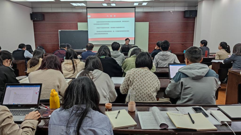 接着,学院党委副书记杜倩博领学《中国共产党组织机构设置的百年历程与经验》。杜倩博将党的组织机构设置分为初创、壮大、系统化、调适、强化五个阶段,并提炼出经验。
