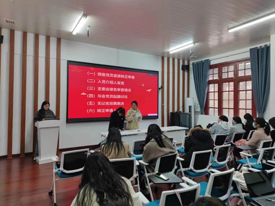 随后,王睿、曾雅琪、宫丽三位同志汇报了预备期间的思想、学习、工作和生活等情况,并审视了自身的缺点和不足,表明今后将以合格党员标准严格要求自己,主动担当作为。支委会介绍了这三位同志在预备期间的教育考察情况,对其能否按期转正提出意见。与会党员同志也就三位同志在预备期间的表现积极发表意见。经充分讨论和无记名投票表决,大会通过了三位同志的转正申请。