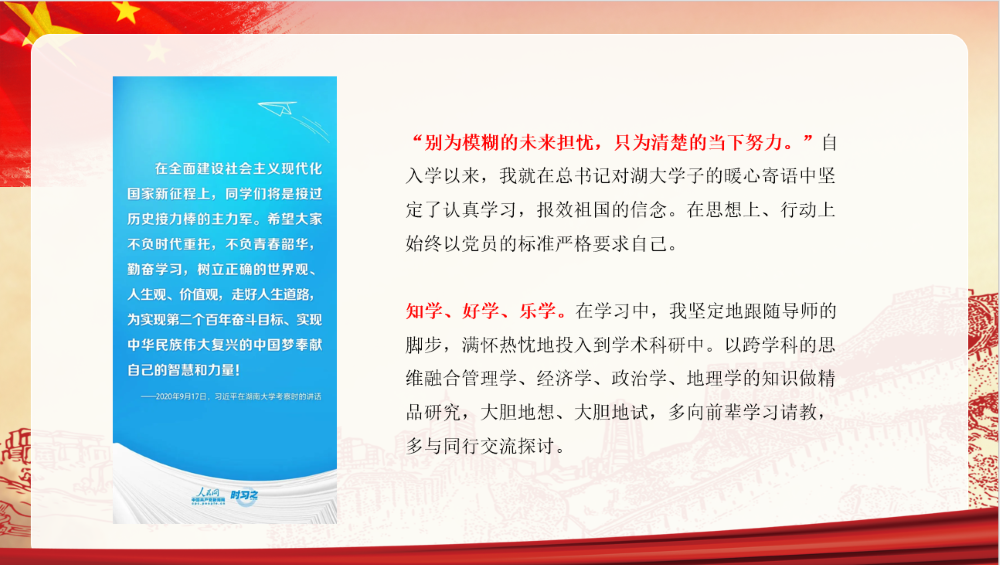 考察时的重要讲话。强调自己在总书记对湖大学子的暖心寄语中坚定了认真学习,报效祖国的信念,并在在思想上、行动上始终以党员的标准严格要求自己。接着,他从多和师友交流、跨学科知识积累、多参加学术会议和学科竞赛、如何开展合作和如何面对挫折等方面进行分享。他指出科研之路不可能是一帆风顺的,更多的是一波多折。但他始终坚信办法总比困难多,只要脚踏实地,勤于思考,不断总结经验、吸取教训,必然克服困难。