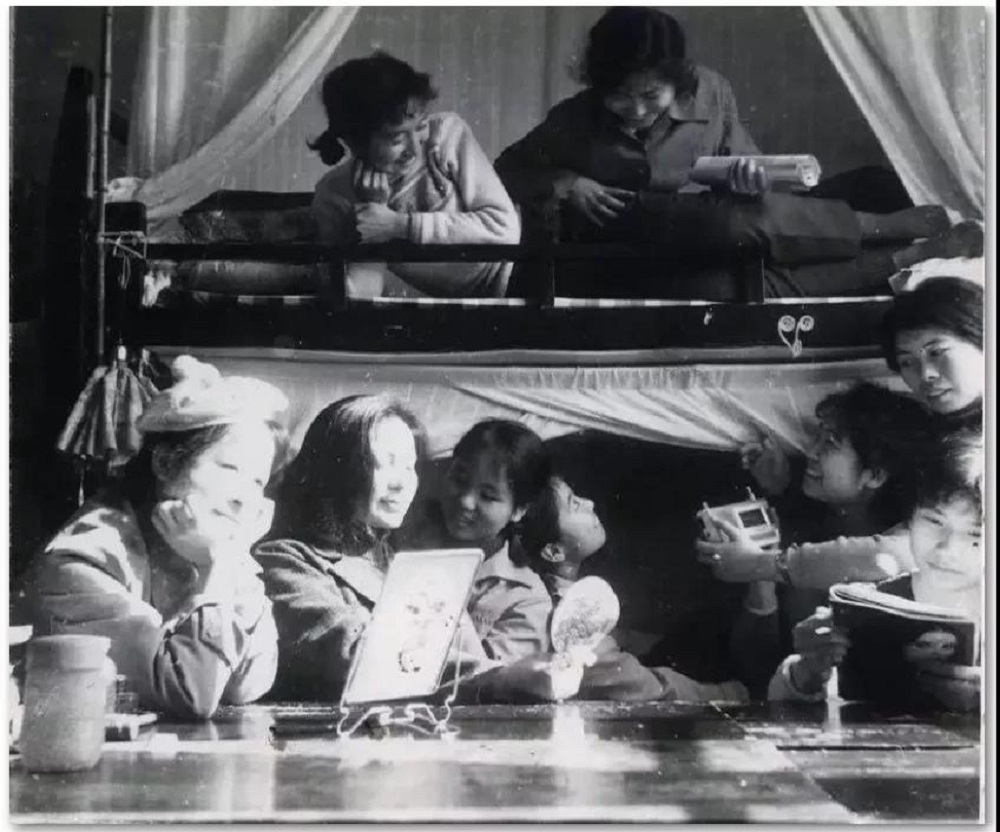 (77级自动化班女生在九舍的寝室内留念)