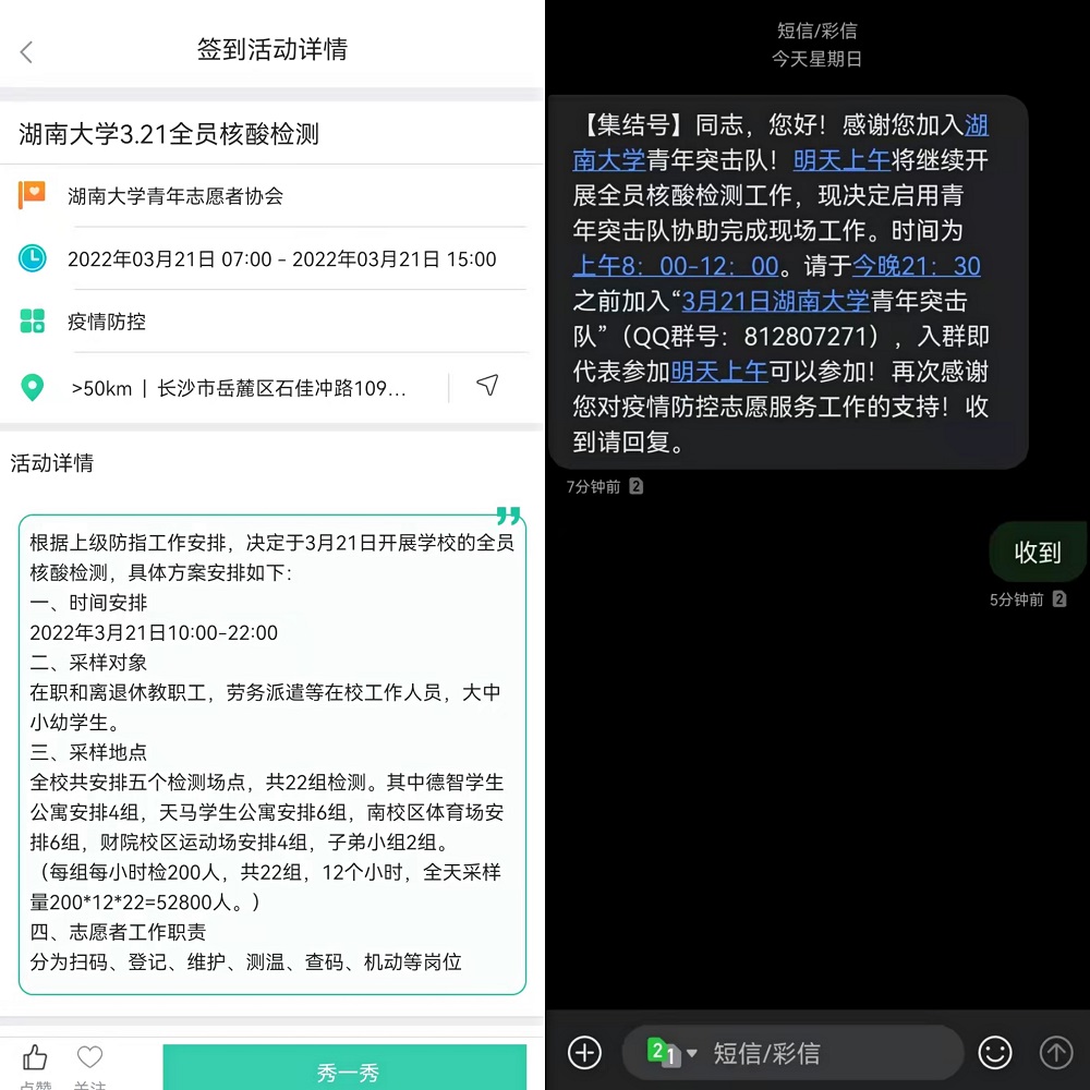 青年突击队。疫情期间积极响应号召参加疫情防控志愿服务工作,在德智公寓园区以及南校区体育场协助现场核酸检测工作、主要负责检查健康码、维护现场秩序等,为疫情防控贡献自己的微薄力量。