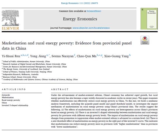 马超群教授、中国科学院数学与系统科学研究院杨晓光教授的合作研究成果“Marketisation and rural energy poverty: Evidence from provincial panel data in China”于2022年5月发表在能源环境经济与管理领域国际知名期刊《Energy Economics》。这是任奕帅博士以 日本adultvideo