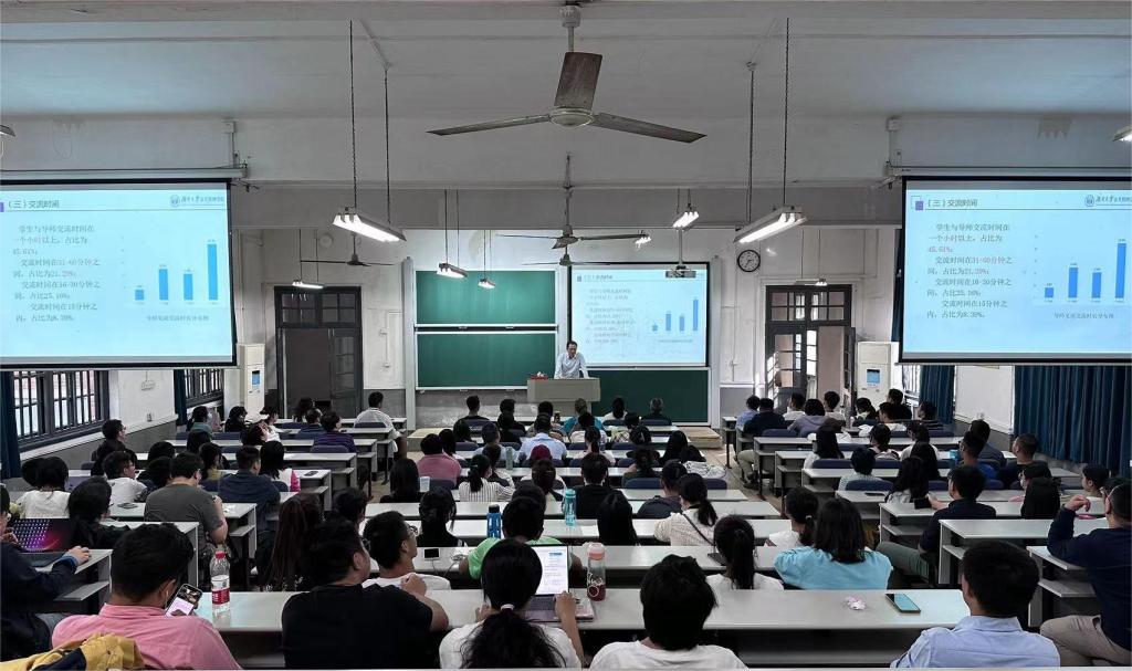 本科生导师制及其实施情况。谭老师从导师与学生之间的交流频率、方式、内容、存在问题和建议等方面向大家详细介绍了本科生导师调查情况,希望导师能够切实履行导师职责,学生能够积极向老师请教。