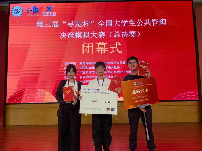行政管理专业2022级本科生白瑞浩、乔冠伦、王玥琪同学组成的参赛团队先后在华中区赛和全国总决赛中经过方案设计、沙盘对抗、团队答辩多个环节的角逐,最终从全国300支队伍中脱颖而出,荣获华中赛区“特等奖”、全国总决赛“一等奖”,指导老师谭海波、杨晶被授予“优秀指导教师”。