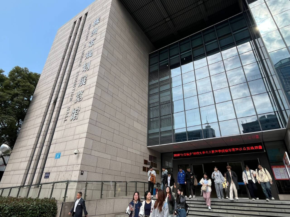 师生首站走进株洲市规划展览馆。在规划展厅,专业人员讲述了株洲从工业小城成长为工业名城的历程,重点介绍了株洲作为神农胜地的独特魅力与文化遗产。同学们通过沙盘模型与数据可视化系统,系统学习片区的治理逻辑,全方位感受株洲在经济、文化等方面的成就。