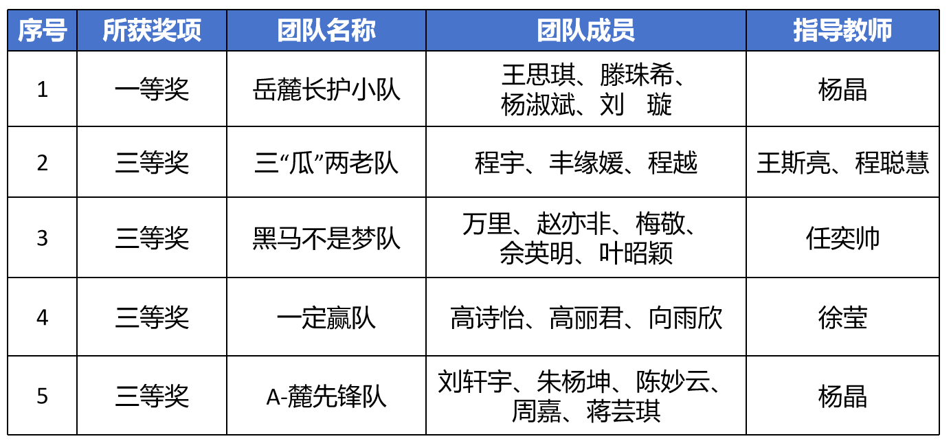 师生凭借扎实的专业基础、灵活的思辨能力和默契的团队协作,取得亮眼成绩:“岳麓长护小队”,决赛获得最高分91.17分,荣获一等奖第一名;同时,4支队伍获得三等奖;此外,取得“优秀组织单位”、“优秀指导教师”、“最有价值队员”多项荣誉。