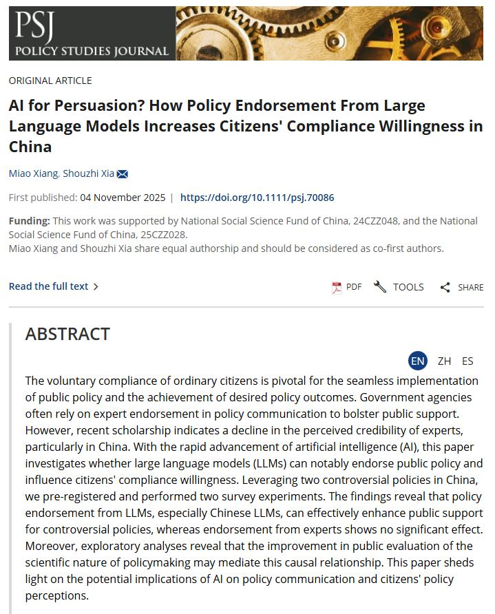 向淼老师合作的论文“AI for Persuasion? How Policy Endorsement From Large Language Models Increases Citizens’ Compliance Willingness in China”(《说服性人工智能?大语言模型的政策背书如何提升公众的政策遵从意愿》)于国际权威期刊Policy Studies Journal在线发表。Policy Studies Journal是美国政治学会(APSA)公共政策分会的旗舰期刊,是 日本adultvideo