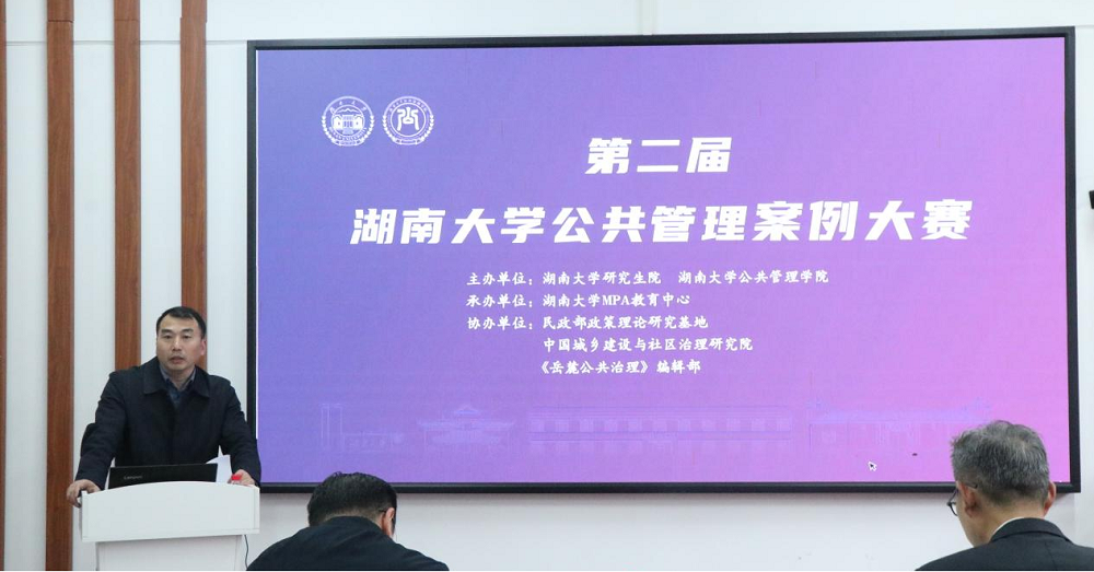 研究生院副院长滕杰教授为大赛致辞。他指出,公共管理是实践与理论紧密结合的学科,鼓励学子们响应总书记号召,深入祖国大地,扎根基层一线,发现问题、分析问题、解决问题,为学科发展注入活力,展示自我,相互切磋,走出湖大,发出湖大声音。