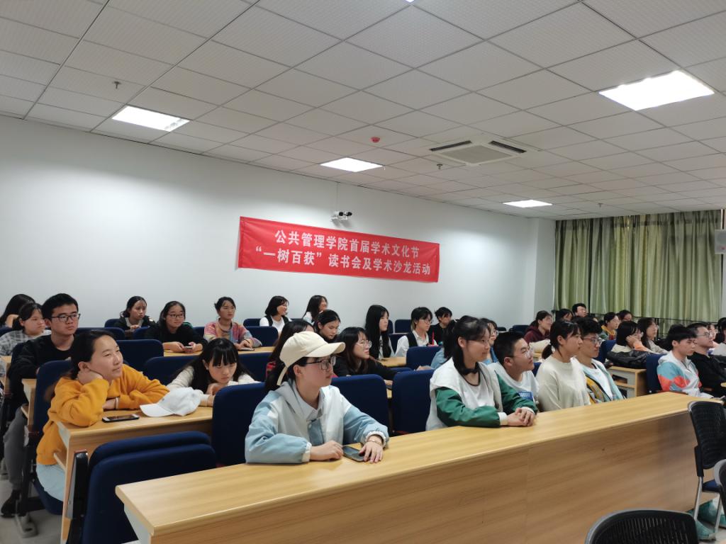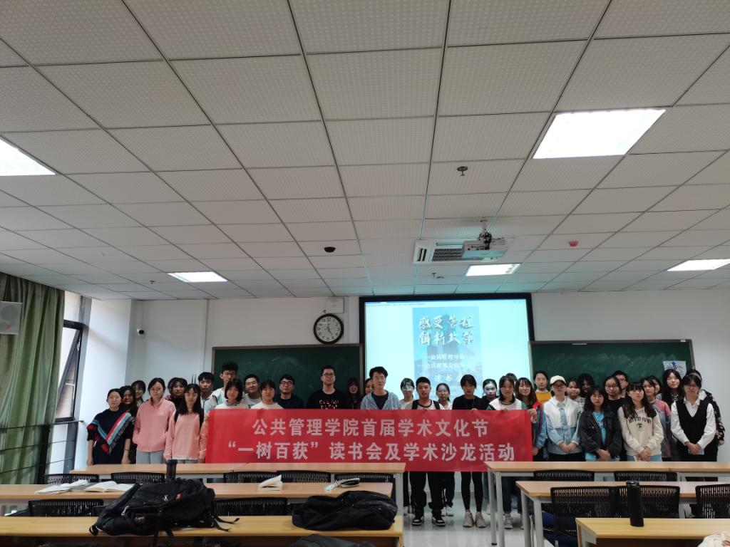 学术文化节系列活动之一“一树百获”读书会于研楼B303教室顺利开展。本次读书会由行政管理1901班与1901班联合举办,行管1901班与1901班全体成员参与。