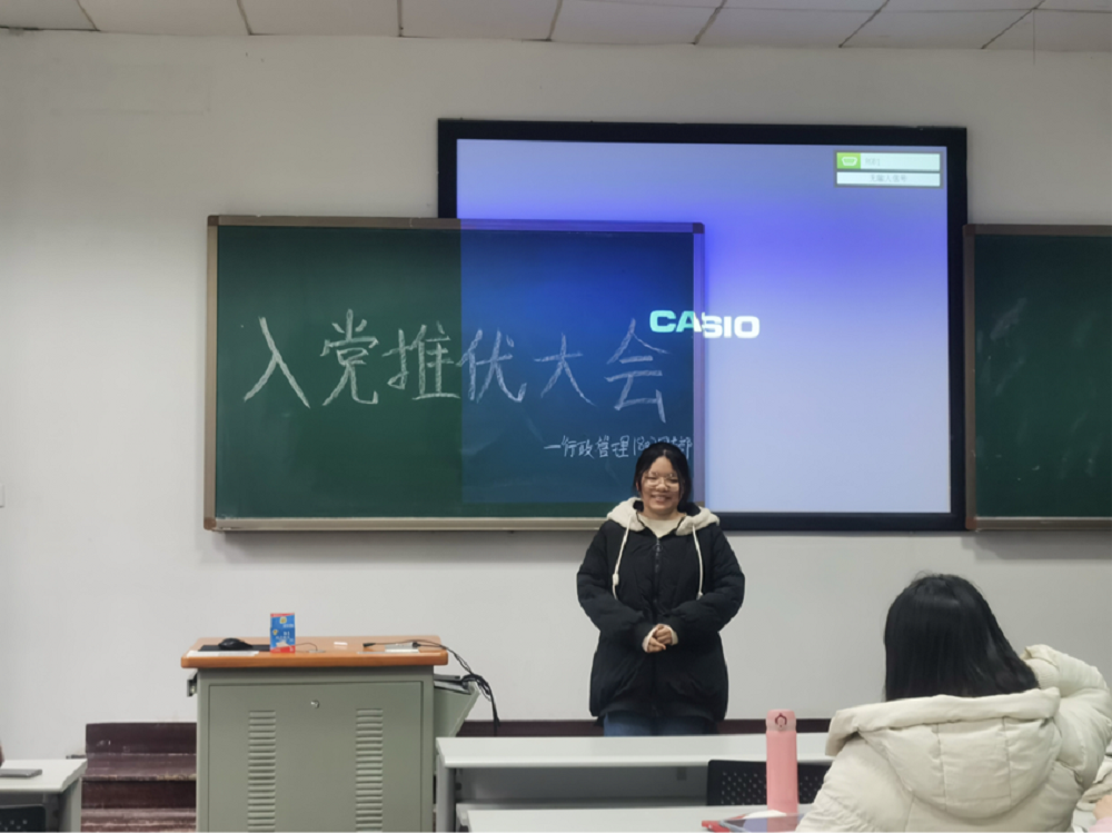 首先,团支书陈欣向大家宣读大会流程、推优条件等相关事宜,明确本次推优完全遵循民主评议的原则,是为了端正团员的思想动机,引导团员更加积极紧密地向党组织靠拢。入党积极分子候选人胡亚辉进行竞选陈述演讲。她表明自己想加入党的态度与原因,对党的理解与认知以及对党的热爱与渴望;同时,她也提出自己未来的发展目标,希望自己在接下来的大学生活中,不断提高、完善自身,做好积极带头作用,向着成为一名优秀共产党员的方向奋斗。