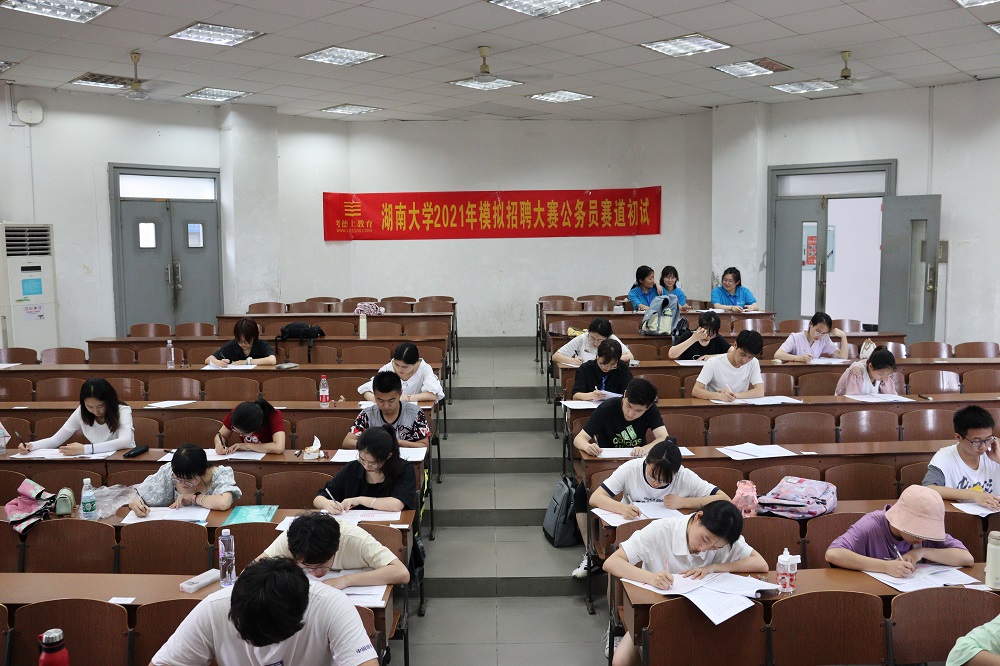 研究生院楼A303进行补考。公考赛道初赛笔试环节包括行政职业能力测试及申论,考试时间安排严格按照国家公务员考试流程进行,《行政职业能力测验》满分100分,要求在120分钟内完成;《申论》满分100分,要求在180分钟内完成。行政职业能力测验共135题,包括言语理解与表达、数量关系、判断推理、资料分析与常识判断五个部分,各部分分值不同。由于题量较大、时间较紧,参赛学生争分夺秒、认真答题。申论考试共5题,分别对应归纳概括、综合分析、贯彻执行、提出对策及作文写作五大题型,主要考察考生的阅读理解能力、综合分析能力、提出和解决问题的能力、文字表达能力。参赛学生仔细阅读、严谨思考,按照题目要求分析材料,合理提出对策及建议。