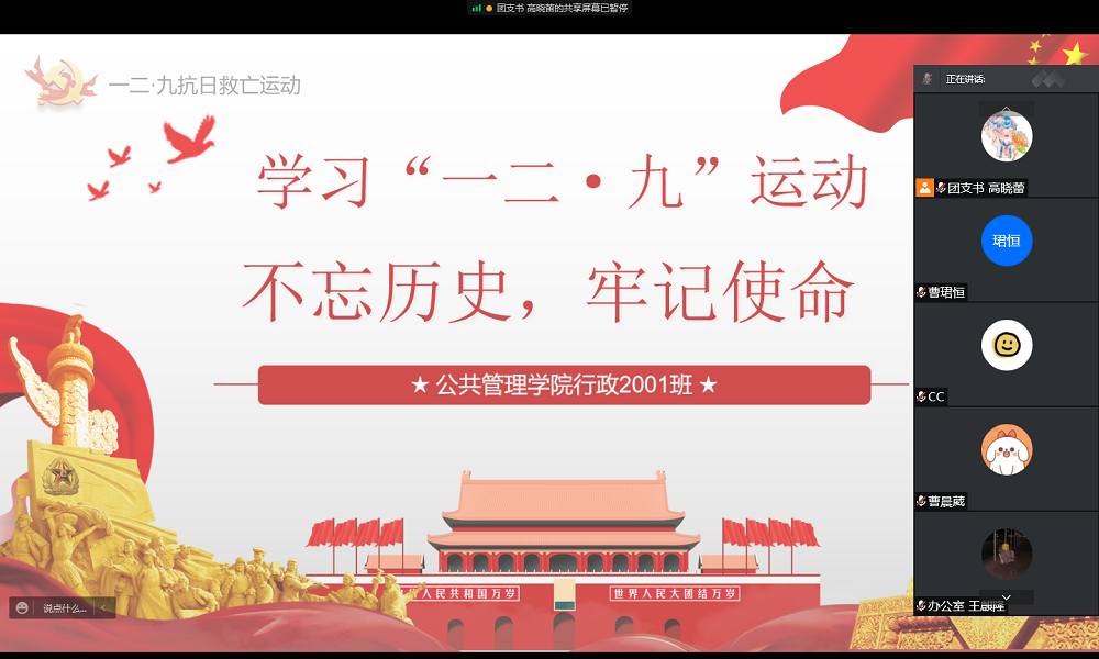 行政管理2001班开展“学习‘一二·九’运动”主题班会。为推进疫情防控工作顺利进行,此次主题班会采取线上会议形式,由行政2001班团支书高晓蕾同学主持,行政2001班全体同学参与。