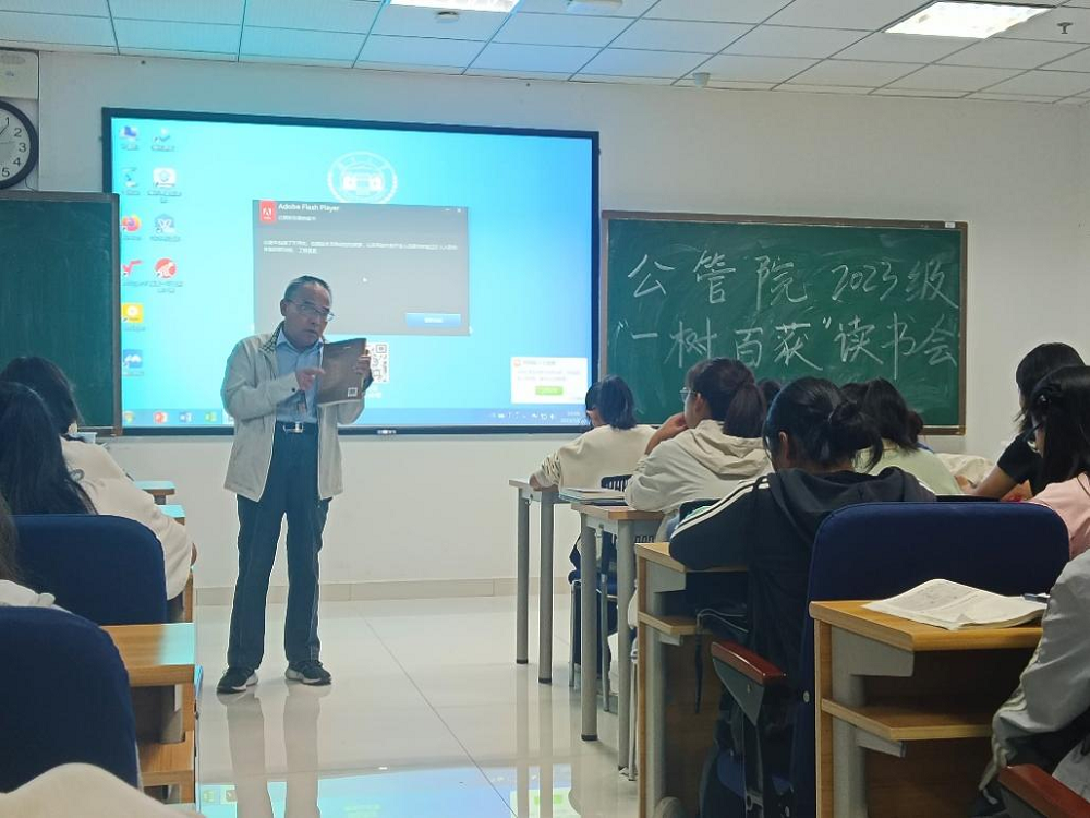 为营造良好的专业学习氛围,帮助学生夯实公共管理专业基础,学院组织2023级学生于10月25日晚参加“一树百获”读书会活动,邀请李金龙老师为同学们分享欧文·E·休斯所著《公共管理导论》一书,23级全体学生参会。