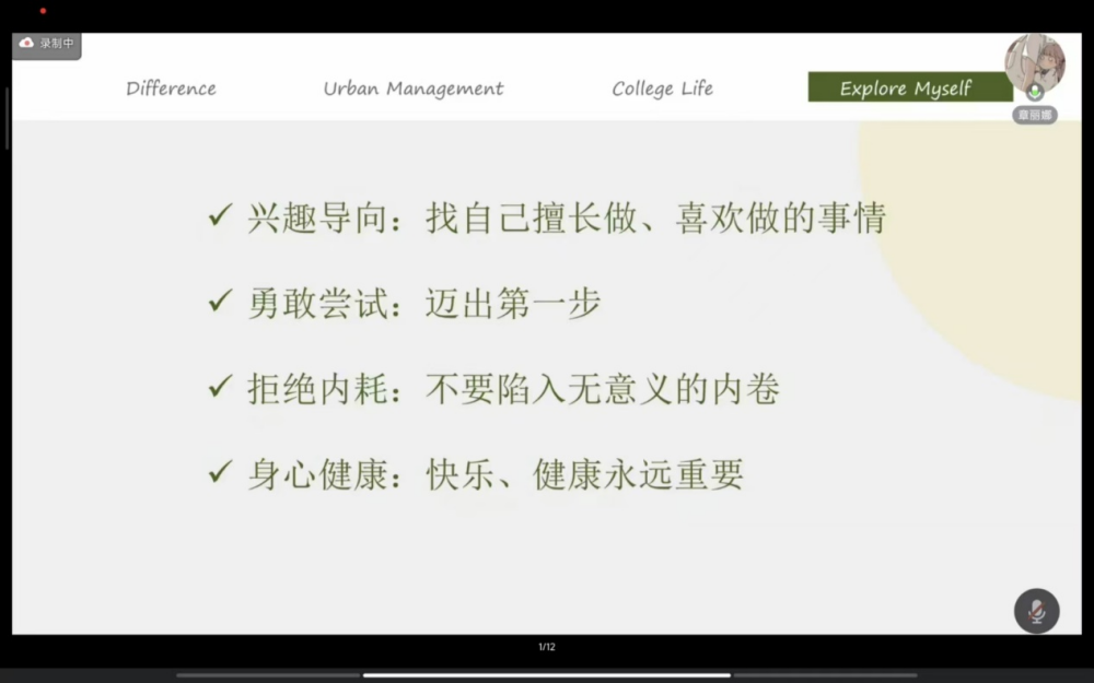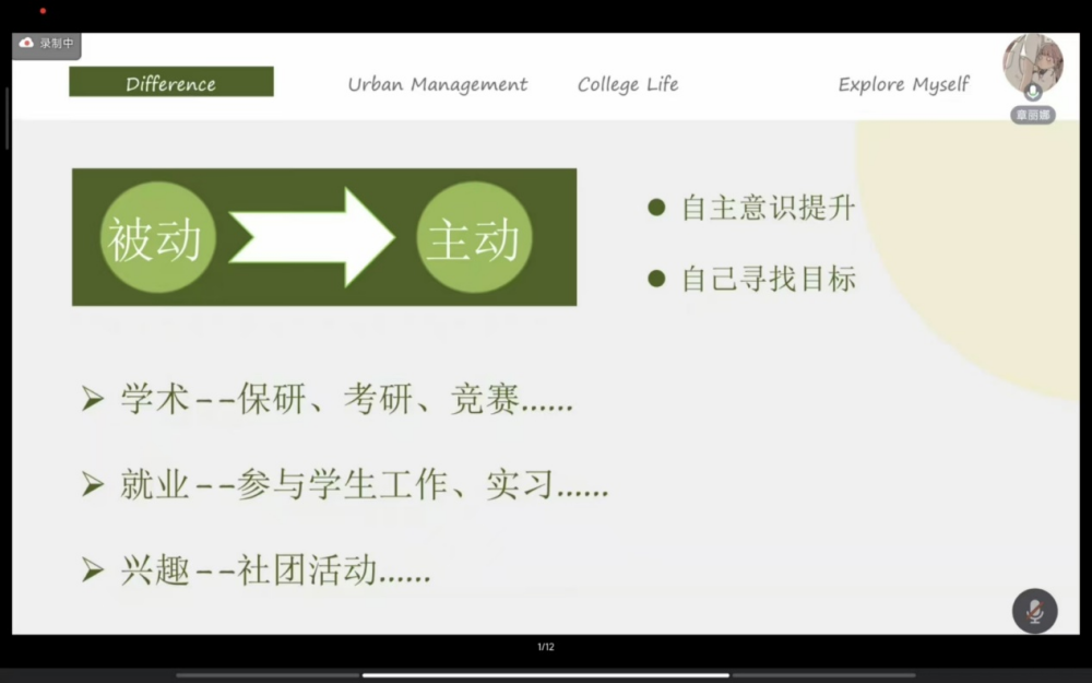 接下来由章丽娜学姐为2024级为新生带来了以“探索自我的N种可能”为主题的分享。章丽娜学姐首先点名了大学与高中的区别即要从被动学习转化为主动学习,提升自我意识,树立自我目标,随后章丽娜学姐就城市管理专业的学科特点展开的详细介绍,指出了主动学习是学好城市管理专业相关课程的关键,并就阅读书目、教师资源、学习方法、相关竞赛、就业前景等方面进行了讲解。最后章丽娜学姐在介绍丰富多彩的大学生活的同时鼓励广大2024级新生勇于探索,追梦青春。