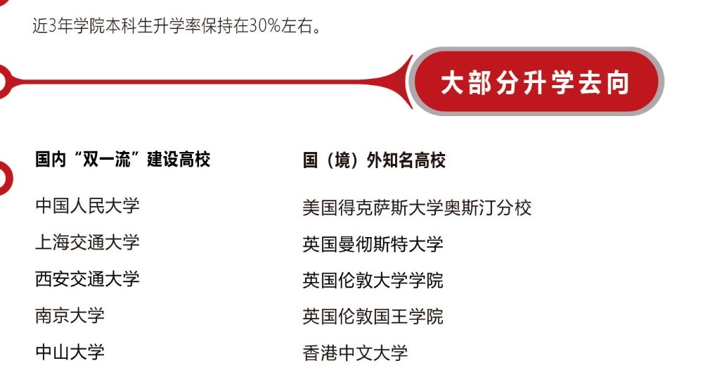 近3年本科生初次就业率均为100%,稳居全校第一名,多在各级党政机关、事业单位、社会组织、世界500强企业以及国内外知名企业工作。近3年学院本科生升学率保持在30%左右,大部分升学去向为中国人民大学、上海交通大学、西安交通大学、南京大学、中山大学等国内“双一流”建设高校,以及美国得克萨斯大学奥斯汀分校、英国曼彻斯特大学、英国伦敦国王学院、英国伦敦大学学院、香港中文大学等国(境)外知名高校。