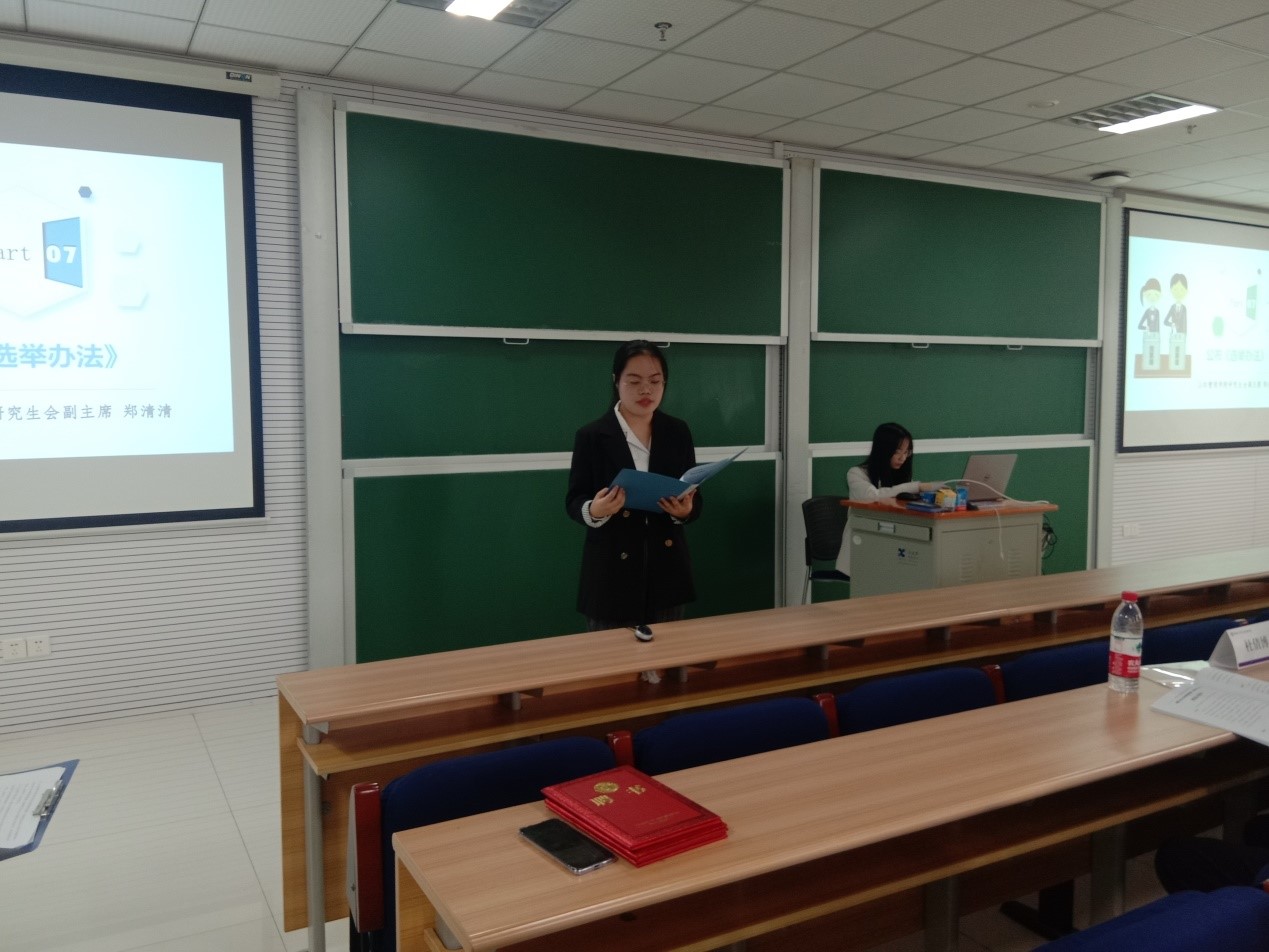 第一届研究生会主席叶玮作《研究生会工作报告》,副主席郑清清宣读《选举办法》。随后由监票人刘静、李明两名同学向在场的参会人员展示票箱。