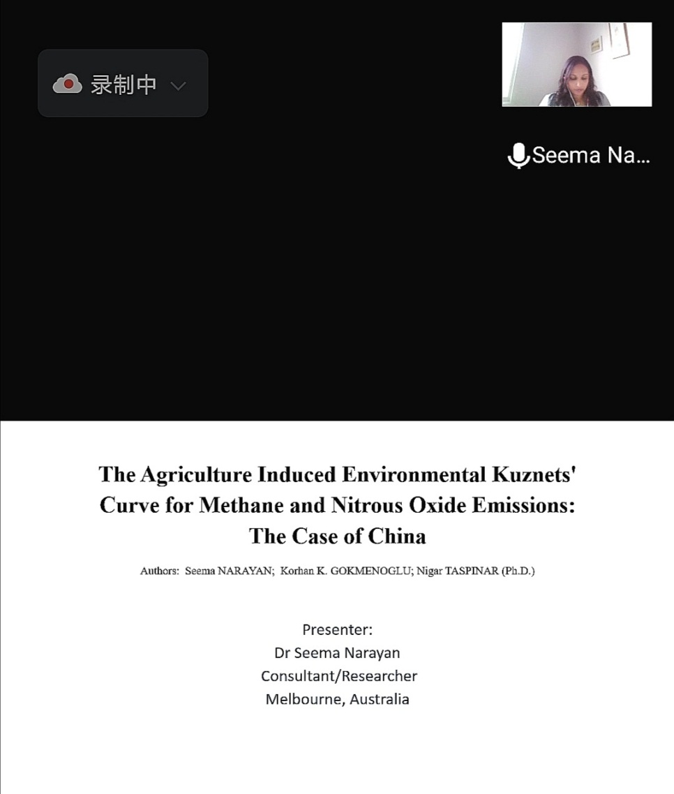 和中国城乡建设与社区治理研究院联合主办、城乡发展与环境治理研究所承办的第五期“城乡发展青年学者沙龙”通过腾讯会议在线上顺利举行。澳大利亚墨尔本研究员Narayan老师受邀担任本场活动的主讲嘉宾,做了题为“The Agriculture Induced Environmental Kuznets' Curve for Methane and Nitrous Oxide Emissions: The Case of China”的学术报告。本次活动由任奕帅老师担任主持人,城乡发展与环境治理研究所十余名硕士研究生参加了此次活动。