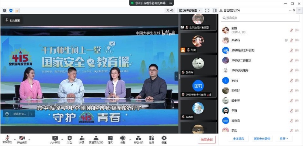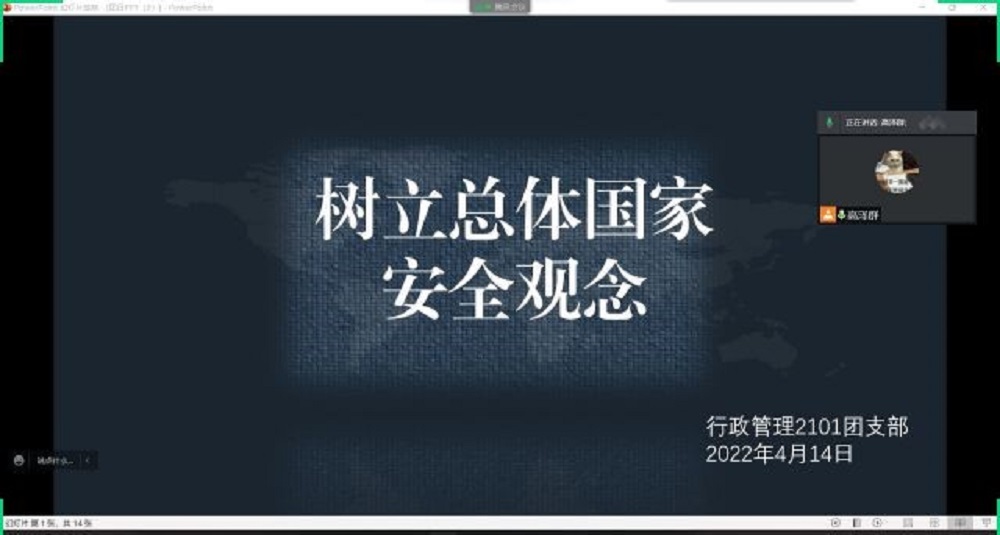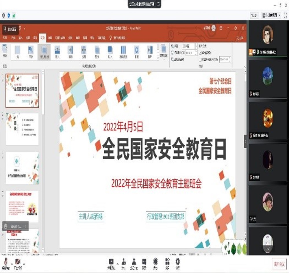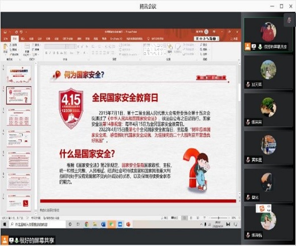 19级、20级硕士班团支部组织召开线上会议,使学生充分认识到维护国家安全的重要性。宣讲维护国家安全的重要意义和具体措施,提升学生的社会责任感,更加清晰地意识到维护国家安全人人有责,通过强调国家安全教育日的重要性来激发学生对于维护国家安全的责任意识,上好国家安全法律知识课。