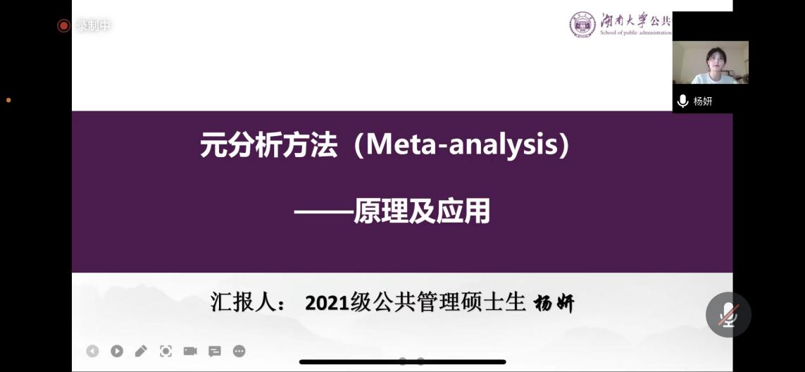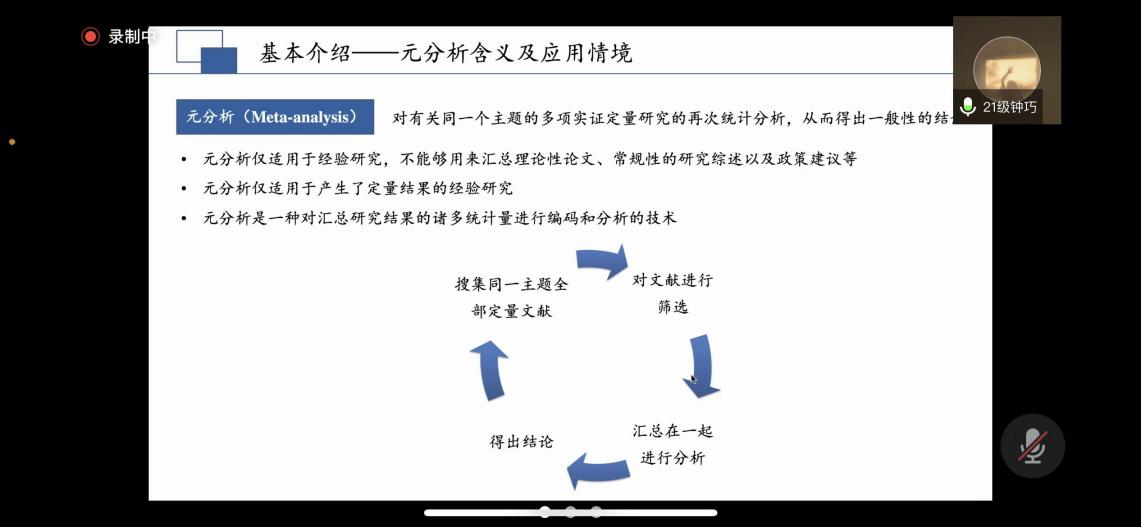 杨妍同学从不同学者对元分析方法的定义着手,介绍了元分析方法的应用情景,并对元分析方法的过程进行了详细阐述,即问题指定与研究回溯—编码—选择、计算效应值统计量—分析效应值的均值与分布—灵敏度分析—总结成文,在此基础上以于增艳等学者的文献《儿童期受虐经历与抑郁的元分析》为例,进行了元分析方法的实际应用操作展示。