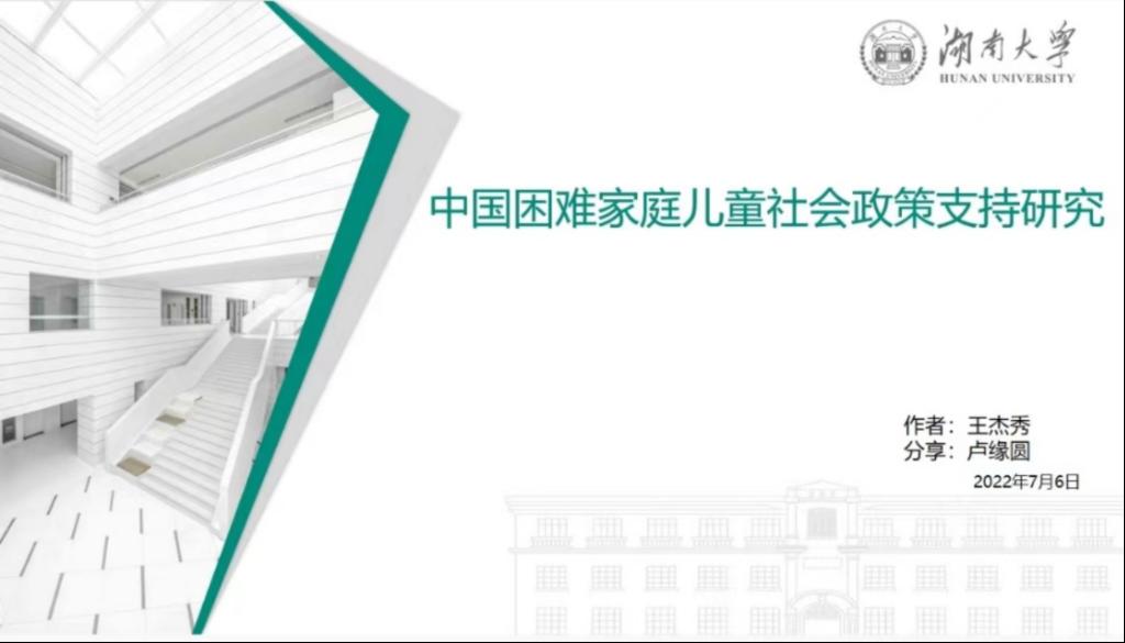 卢缘圆同学介绍了由王杰秀主编的《中国困难家庭儿童社会政策支持研究》(中国社会科学出版社,2020.),围绕困难儿童营养健康问题的提出、营养健康状况、营养与健康影响因素以及结论与相关政策等方面展开,在展示这本困境儿童福利问题著作的同时,还积极搜索参考国内外期刊文章,对困境儿童社会支持问题以及研究方法的具体应用有了更深的认识。