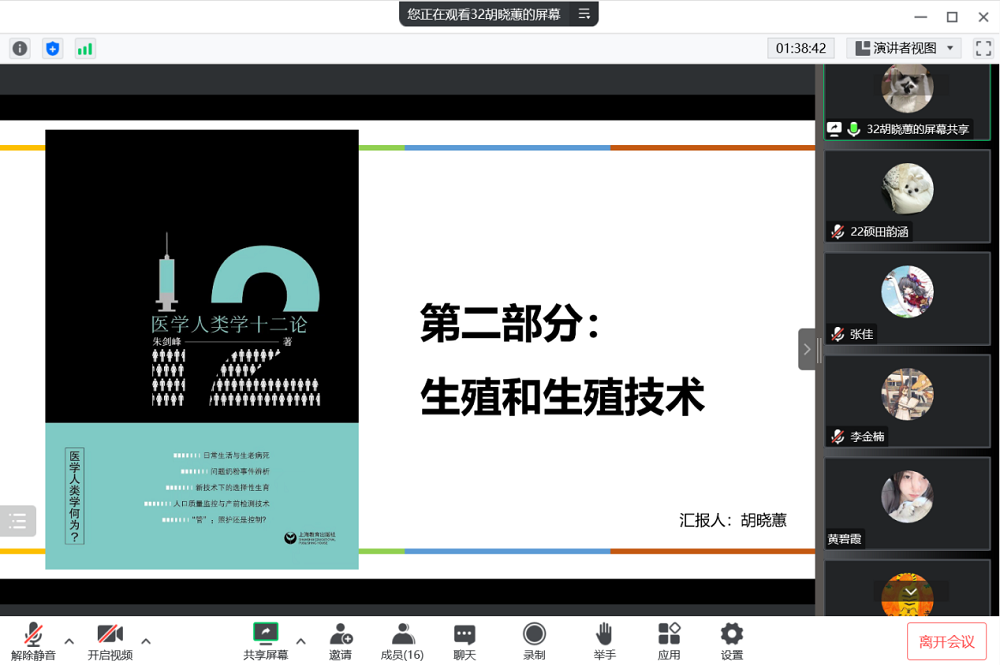 公共健康与社会保障研究所第14期“品读经典”读书会在线上举行。本次读书会分享的经典书目:《医学人类学十二论》(作者:朱剑峰)。本期读书会由周蔚老师主持,硕士生谭雯茜、程美裕、胡晓蕙、杜孟飞先后进行学习分享,研究所十余名研究生参加。