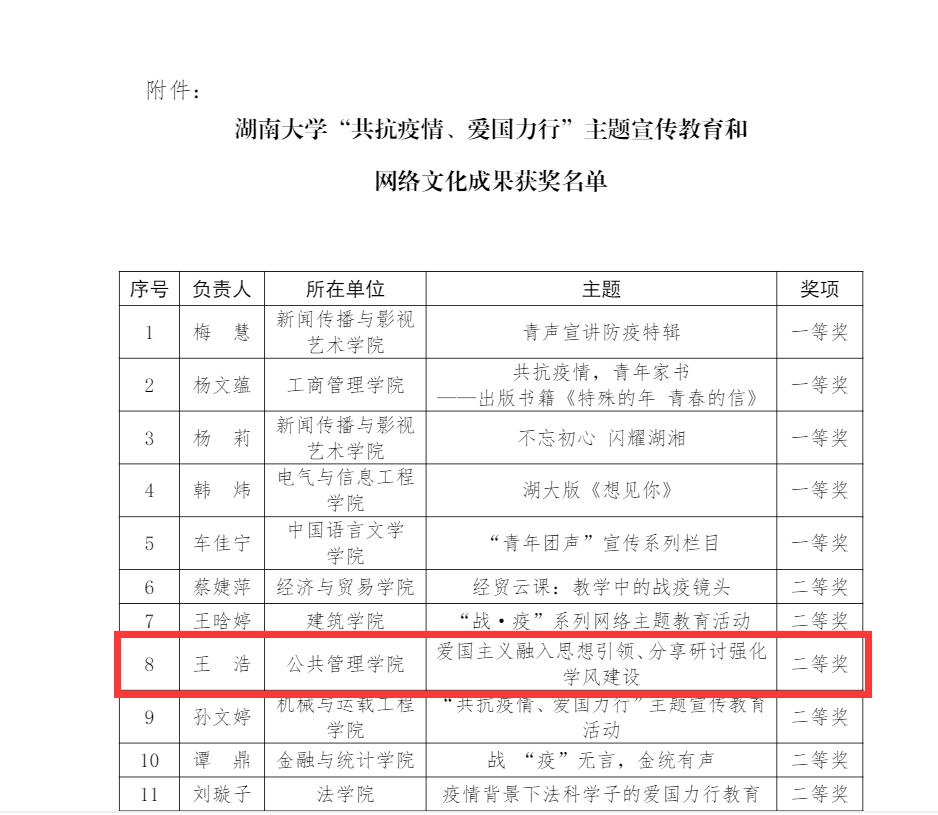 主题教育活动《爱国主义融入思想引领,分享研讨强化学风建设》作品获得二等奖。