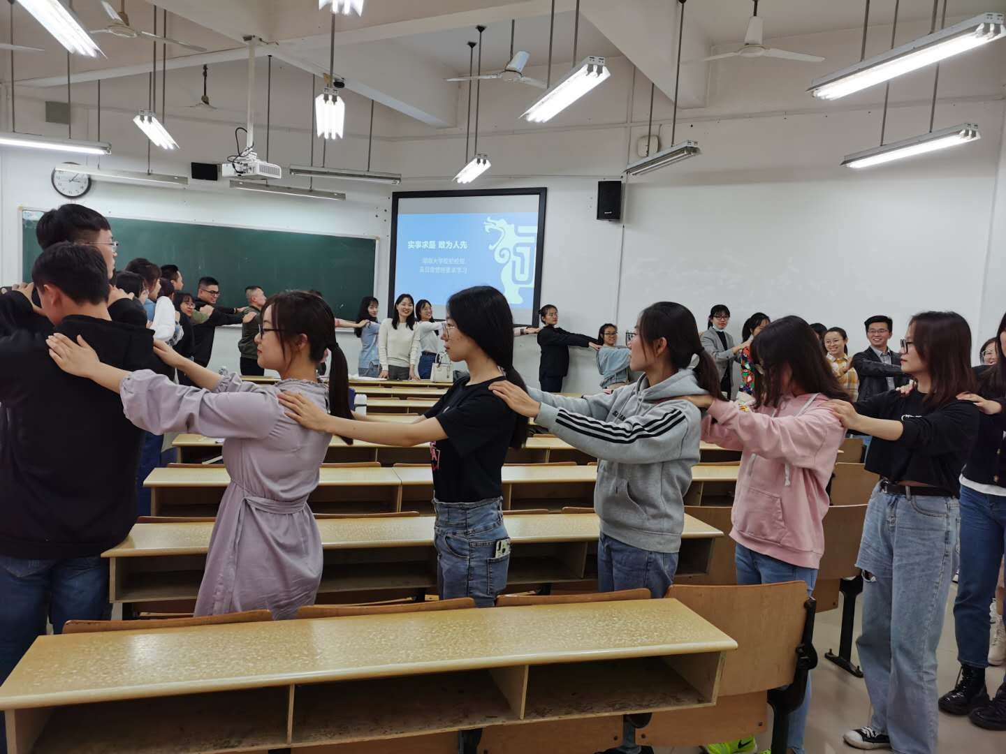 依着杨老师的指令,大家在班级内以握手、猜拳等方式结伴,最终整个班级变成了一条首尾相顾的“贪吃蛇”。在游戏过程中,同学们用热情的微笑融化了原本严肃的气氛,大家开始熟络了起来。