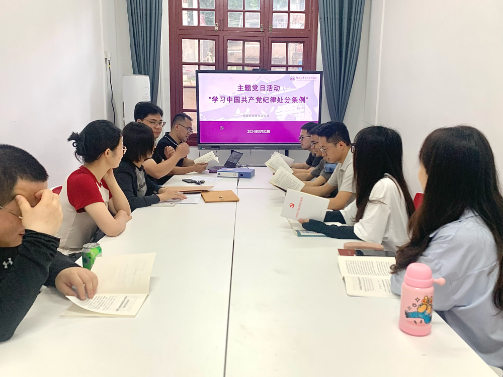 为深入学习贯彻习近平总书记关于全面加强党的纪律建设重要论述,落实党中央关于开展党纪学习教育的重要决策部署,进一步加强党员纪律教育,引导广大党员在工作和生活中严守党的纪律,发挥先锋模范作用,2024528日,行政管理研究党支部开展“学习中国共产党纪律处分条例”主题党日活动。